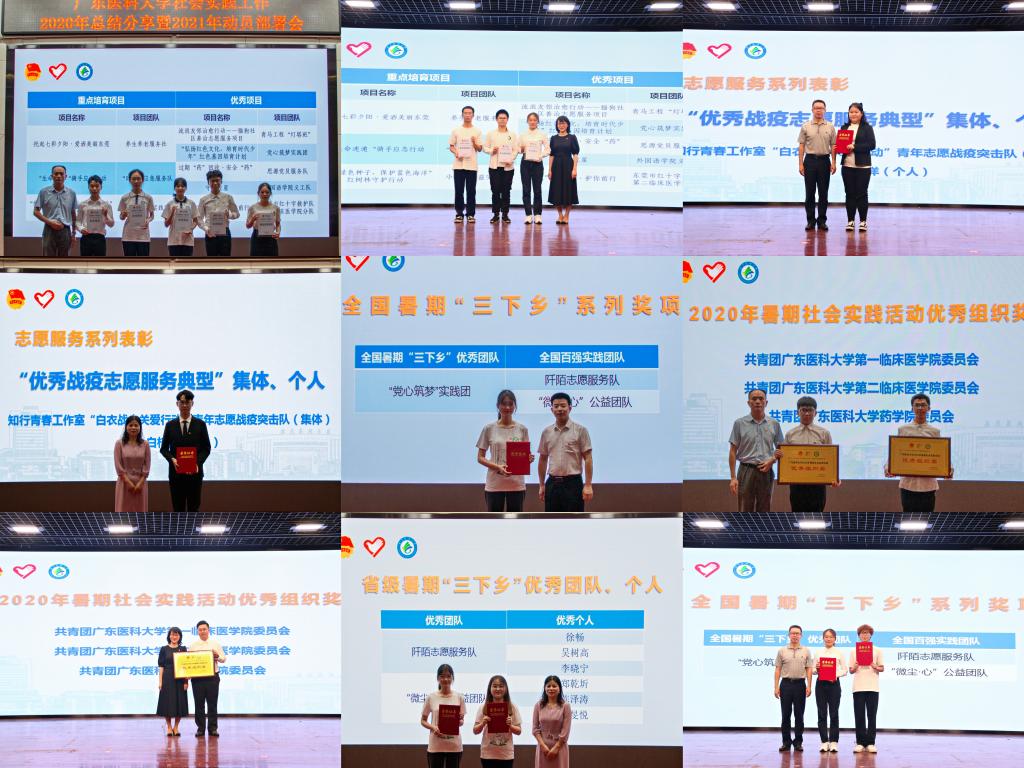 大会对在2020年社会实践和志愿服务活动中表现突出的集体和个人进行了表彰,第五届中国青年志愿服务项目大赛金奖项目代表及全国暑期“三下乡”优秀团队代表在会上作经验分享,两位项目代表从项目立意、项目需求说起,在项目执行的小故事中分享了参与实践服务的感受,诉说医学生的初心使命,引发现场观众的强烈共鸣,坚定了每一位广东医实践人最执着的信念和情怀。