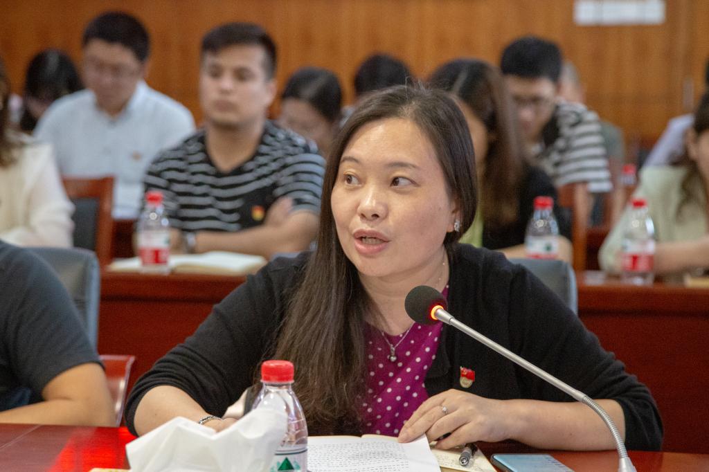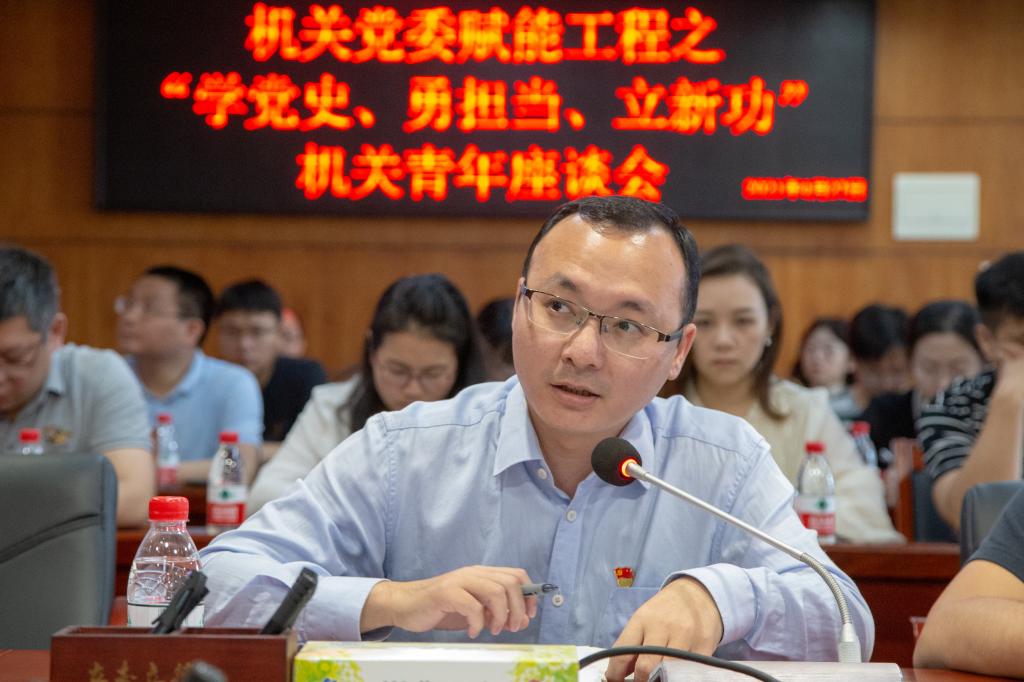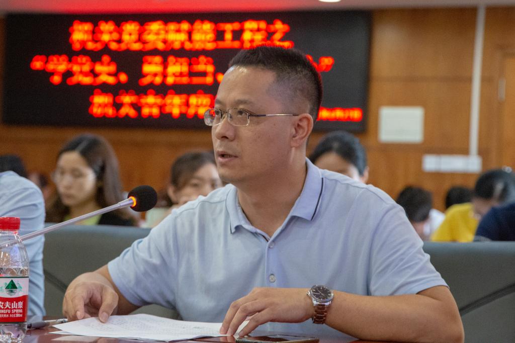 机关党委所辖管理、教辅、科研支部的青年代表陈霞、钟伟金、蒋智文结合本职工作先后发言。三位代表立足本职岗位却又不局限于本职岗位,在日常平凡的工作中,收获着成长的大感悟。既谈及在新时代背景下青年需要具备的政治素养、能力素质、自身修养,又结合党史学习教育分享从学习中领会的工作收获,还围绕新冠肺炎疫情期间中美应对反应,引发现场青年爱国共鸣,鼓励大家爱岗敬业,为祖国发展贡献力量。