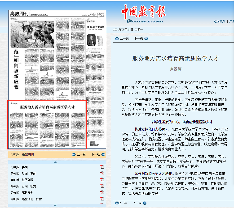 5月24日,《中国教育报》第5版发表新葡萄8883官网AMG党委书记校长卢景辉理论文章《服务地方需求培育高素质医学人才》。