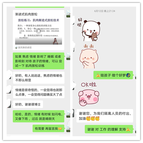 为把隔离点的心理援助工作做的更加细致、周到,服务队每天召开两次线上工作会议,及时交流工作推进、个案处理情况与在隔离点我防护的方法。进驻短短4天,已提供480多人次的心理评估,通过微信、电话与面谈回访,均予以心理支持、肌肉放松等心理技术处理,服务队的工作得到群众的认可。