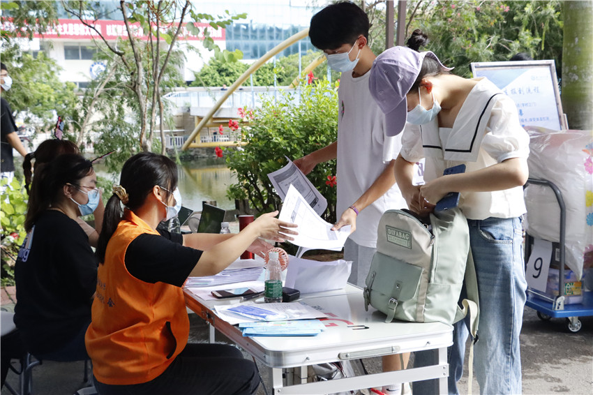 为了做好迎新工作,学校和各学院的所有领导都来到了迎新一线。东莞校区,学校党委书记校长卢景辉更是化身“新同学”,从进门开始,消杀、换口罩、查验健康码、提交“新生材料”,每一个环节他都亲历一遍 ,并及时给出好的建议。中午的时候跟新生们一起吃食堂,在饭桌上不忘跟学生们交流食堂的伙食,并一一记下学生们的建议,第一时间反馈给后勤管理部门。党委常委、副校长曾志嵘跟各学院党政领导班子和相关职能部门负责人在树荫下召开“露天会议”。湛江校区,党委副书记、纪委书记,广东省监委驻新葡萄8883官网AMG监察专员向献兵,党委副书记罗辉分别前往学生宿舍慰问新生,在跟新生唠嗑过程中为新生们上了“大学第一堂课”。(文/王丽君 周圆 刘雨冰 梁湘怡 余江南 图/王丽君 周圆 汤碧璇 过拥民 冯宗源 编/周圆 审/冯锦山)