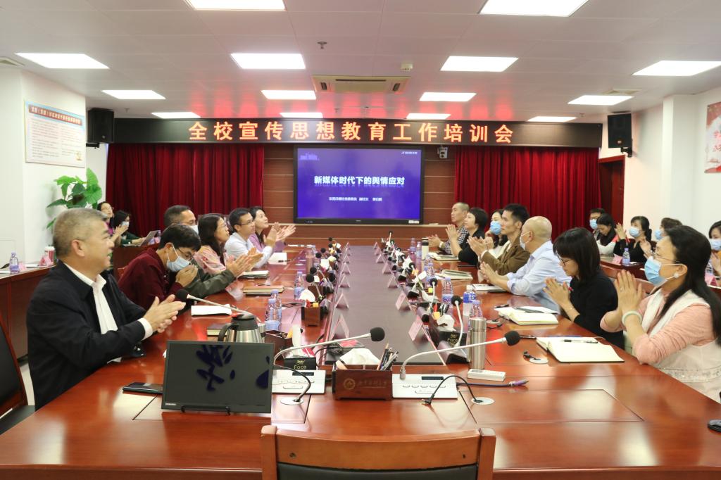 11月12日下午,东莞日报社党委委员、副社长雷石鹏高级记者应邀来校作题为《新媒体时代下的舆情应对》专题辅导报告。学校各基层党委(党总支)书记、副书记,各部门分管宣传思想教育工作的负责人,全体通讯员,全体网络评论员,党委宣传部全体人员等在东莞、湛江两校区第一会议室参加报告会。学校党委副书记罗辉主持学习会。