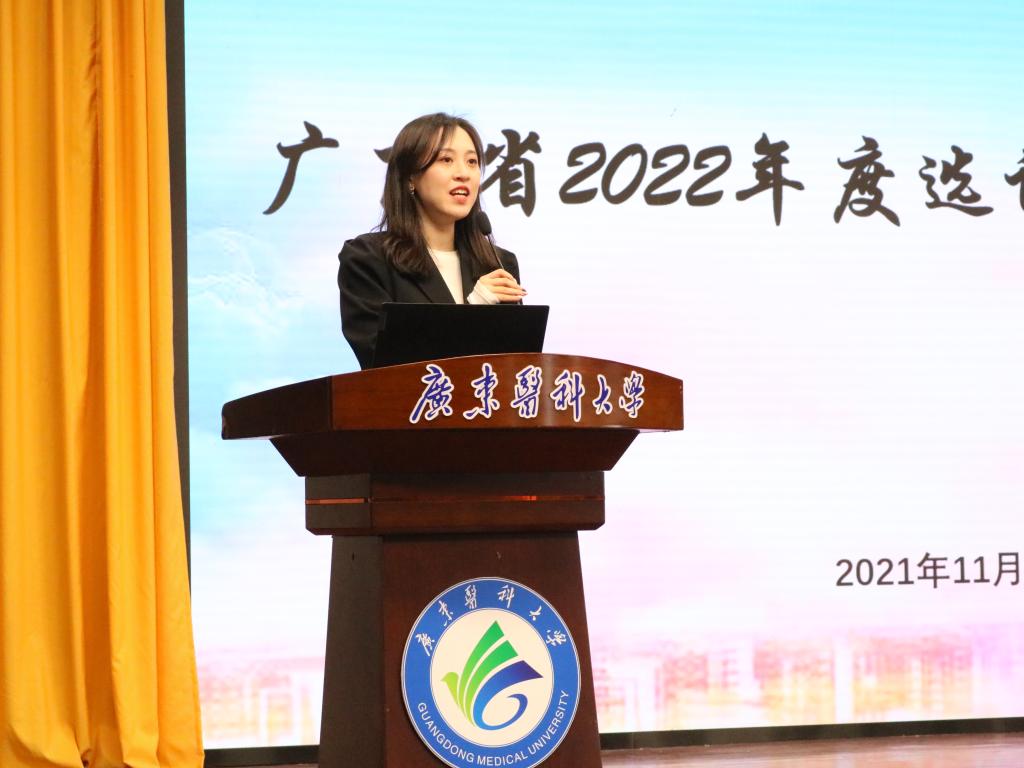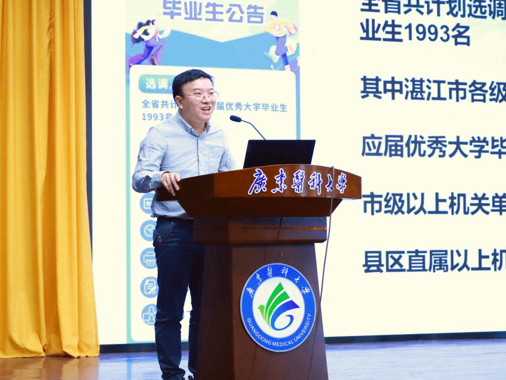 湛江市委组织部公务员二科干部周易涵首先上台宣讲,她结合精心制作的视频宣传材料,详细介绍了著名宜居城市------湛江美丽的风土人情、独具的地区优势,湛江市的城市定位、发展规划、未来前景展望等情况;并对考录湛江选调生的优惠政策做了分析解读。选调生,是各省委组织部门有计划地从高等院校选调品学兼优的应届大学本科及其以上毕业生到基层工作,作为党政领导干部后备人选和县级以上党政机关高素质的工作人员人选进行重点培养的群体的简称。其中,2022年度湛江市各级党政机关、部门115个岗位共招录选调生125人;湛江选调生考试会有一次考试和两次机会:湛江选调生参加招录考试后,若所报考岗位不成功,仍有一次调剂机会。