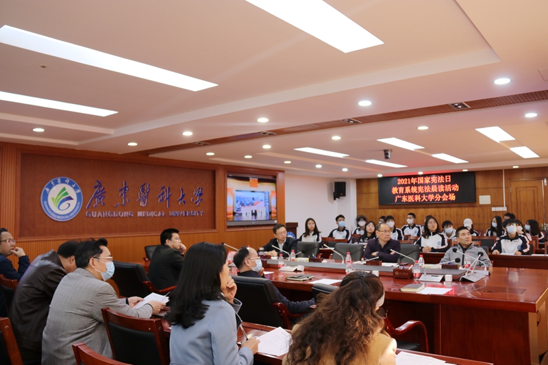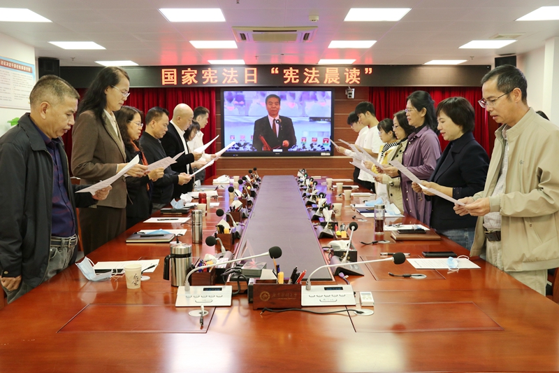 在第八个国家宪法日的前一天,学校在湛江、东莞两校区设分会场参加教育部“2021年教育系统宪法晨读”活动。校领导向献兵、刘新光、曾志嵘,各基层党委(党总支部)书记、各学院院长,各职能部门负责人,学生代表参加了活动。干部师生精神饱满,齐声诵读,庄严而肃穆地感受着宪法作为国家根本大法的神圣不可侵犯性。