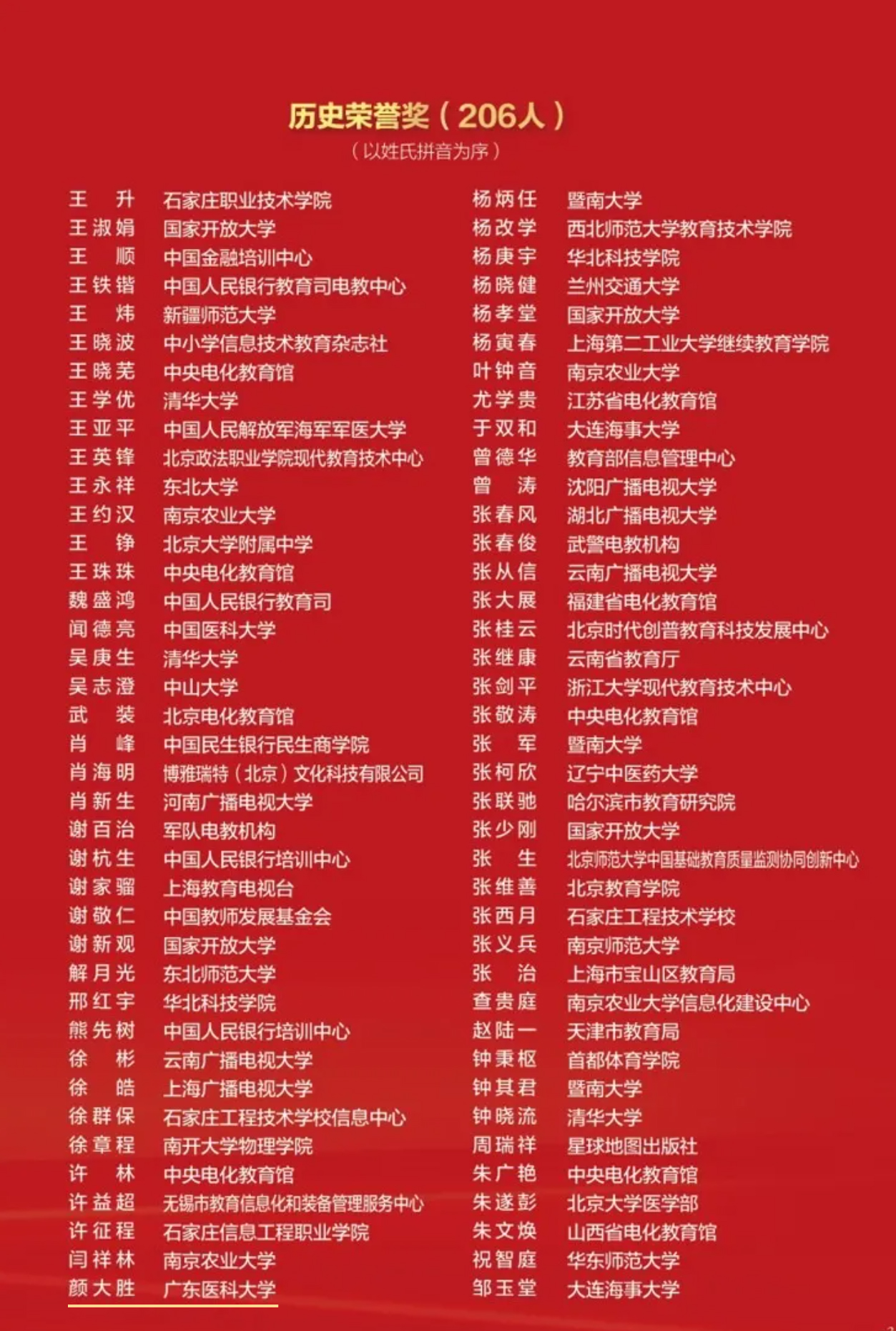 为表彰30年来协会工作先进分子、核心骨干人员不忘初心,努力为教育技术事业奋斗,并取得突出业绩的精神,激励广大会员在新的历史时期更好地做好协会工作,促进全国教育信息化发展,协会公布了一批先进集体和个人名单,包括:“历史贡献奖”8人,“历史荣誉奖”206人,“在会奉献30年纪念奖”247人,“优秀工作者奖”72人,“先进专业委员会奖”24个。新葡萄原副校长颜大胜荣获“历史荣誉奖”,教育技术与信息中心主任陈晓荣获“在会奉献30年纪念奖”。新葡萄原副校长颜大胜多年来一直从事医学教育技术的研究工作,先后历任广东省高校电教研究会副理事长,中华医学会视听教育学会广东分会副主任委员;中华医学会视听教育学会第一届理论学组成员、医学摄影学组副组长,第三、四、五届摄影学组组长,中华医学会教育技术分会委员、常委、副主任委员,候任主任委员、主任委员、前任主任委员,中国教育技术协会常委、医学专业委员会主任委员,《中国医学教育技术》杂志编委。他对医学摄影有较为完整的理论体系建树,共发表论文20多篇;先后承担广东省教育厅教育技术“五个100工程”和“五个一”工程课题项目6项,教育技术研究成果获国家级学会和省厅级教育技术奖20多项次、获广东省科技进步三等奖1项。参与整形外科临床研究,获广东省科技进步二等奖1项,湛江市重大科技进步特等奖1项,厅、局级科技成果奖4项。担任教育技术“十三五”规划教材《医学教育技术教程》副主编;应用教育技术策划开发“五位一体”成人护理本、专科立体教材48部,担任总主编;曾被评为中华医学会教育技术分会先进个人,获中国教育技术协会年度工作成就奖。