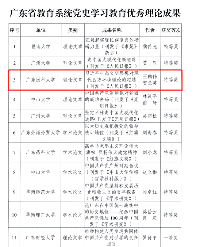2022年1月12日,广东省委教育工委党史学习教育领导小组办公室发布《关于全省教育系统党史学习教育优秀理论成果评选结果的通报》,新葡萄马克思主义学院两篇优秀理论文章榜上有名,王鹏伟、贺兰英撰写的《习近平生态文明思想对现代西方环境理论的超越》获特等奖,黄祖辉撰写的《汲百年党史精粹铸立德树人之魂》获二等奖。这两篇理论文章分别刊发于2021年10月18日《人民日报》和8月9日《南方日报》理论版,由党委宣传部组织上报。