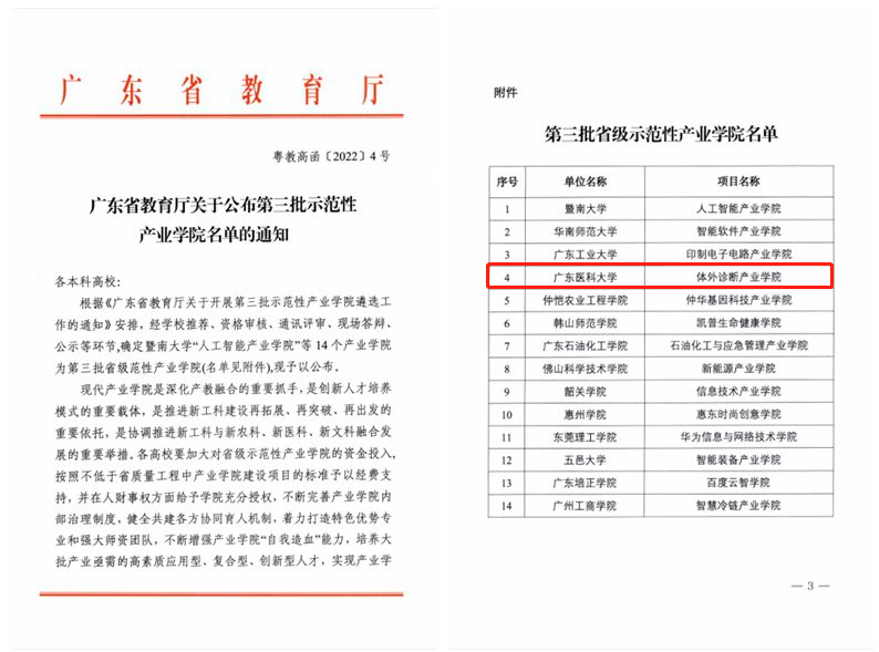日前,广东省教育厅发布了《第三批示范性产业学院名单》,确定全省14个产业学院为第三批省级示范性产业学院,新葡萄医学技术学院申报的体外诊断产业学院成功入选。
