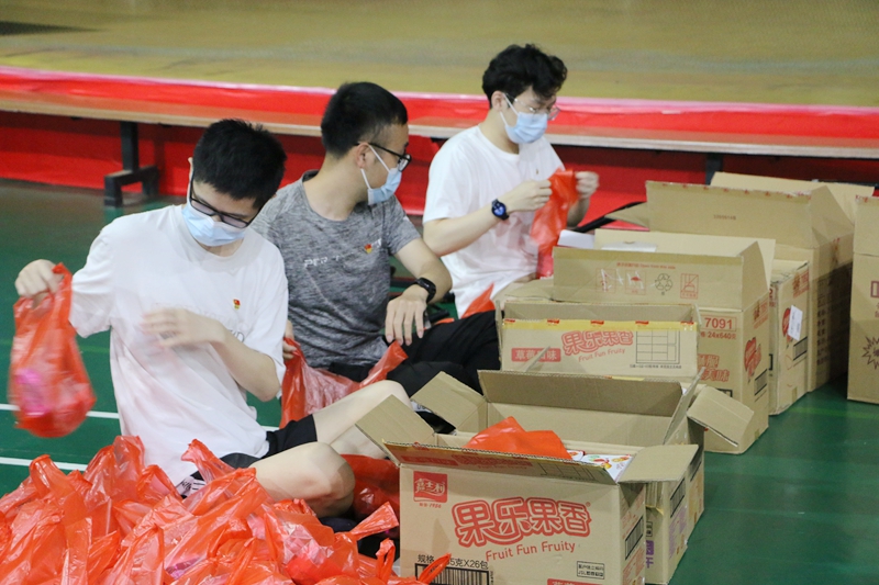 为了挑选同学们爱吃的零食,学工部的老师们在小卖部“蹲点”许久,偷偷观察大家买得最多的是什么。提前一晚,60名学生宿舍疫情防控党员突击队临时党支部组织志愿者花了四个多小时分装礼包6000份。2019级麻醉学专业的宋俊杰笑着说:“零食真的一下子就戳到了我的心坎上!感谢学校在背后默默筑起我们温暖的堡垒。老师同我们一起席地而坐帮忙分装。因为期待着第二天同学们惊喜的样子,大家都干劲满满,甚至连喝水都觉得会耽误进度。”