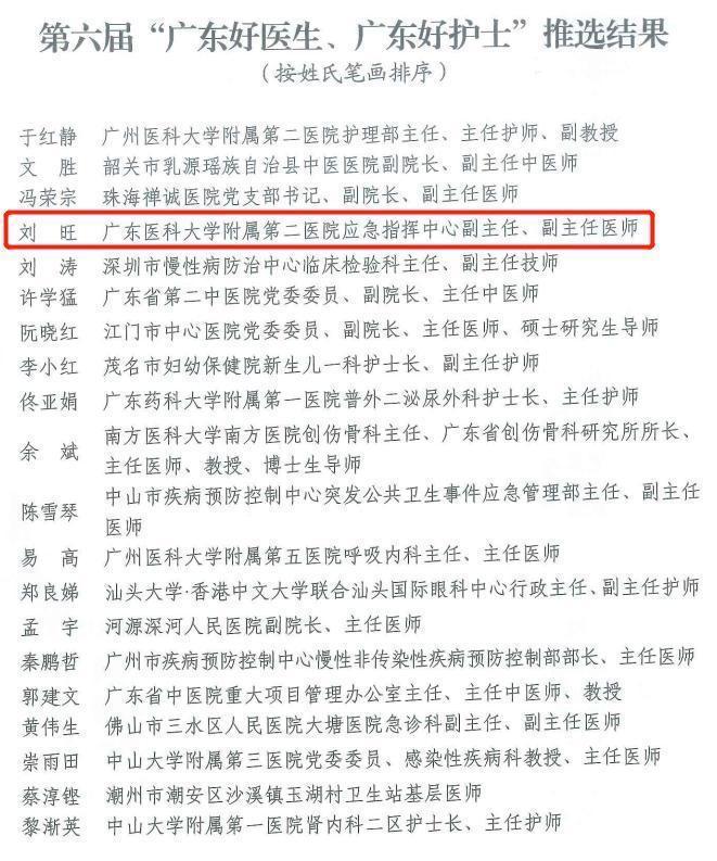 近日,广东省卫生健康委、省文明办、省中医药局、南方日报社、省卫生健康系统思想政治促进会、人之初杂志社等单位联合开展第六届寻找“广东好医生、广东好护士”活动,经各地各部门推荐、活动组委会评审,评出第六届“广东好医生、广东好护士”获奖者20名。其中新葡萄8883官网AMG附属第二医院应急指挥中心副主任刘旺获得第六届“广东好医生”称号。