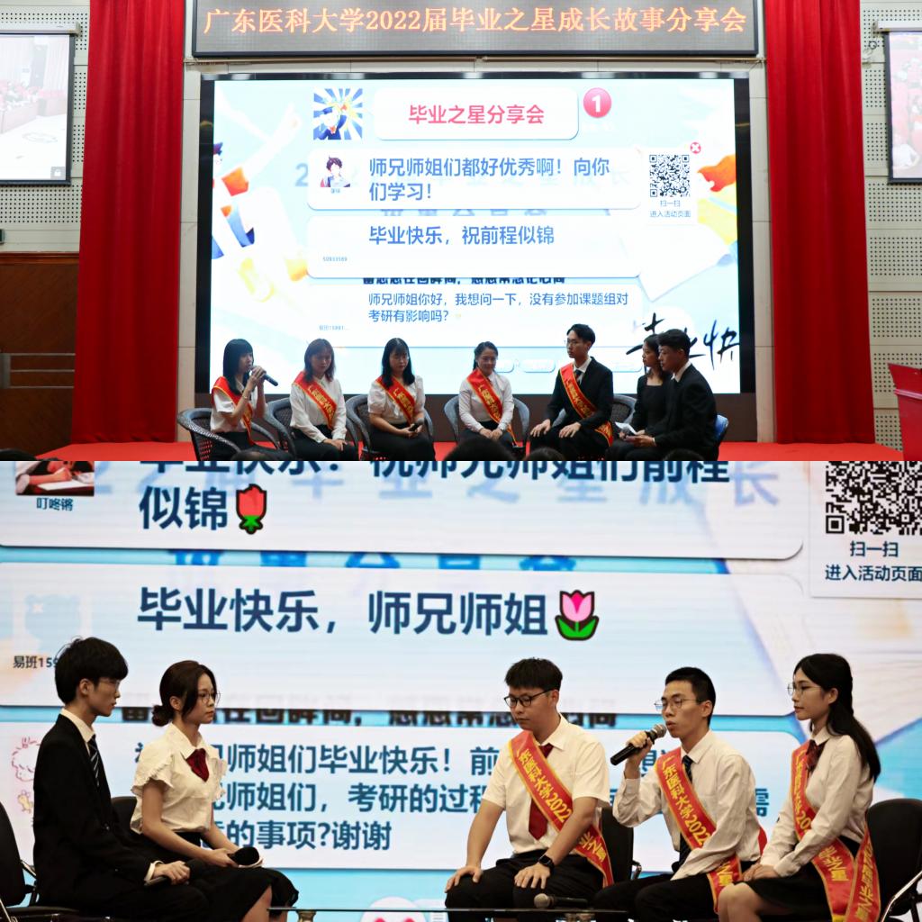 为发挥优秀大学生典型的教育示范、激励引领作用,进一步引导大学生树立正确的成才观和就业观,促进新葡萄的学风、校风建设,6月12日晚,由党委学生工作部主办,第一临床医学院、第二临床医学院承办的2022届毕业之星成长故事分享会在东莞校区行政报告厅和湛江校区九楼会议室举行。学校党委宣传部、学工部、教务处、团委等部门负责人,各学院书记、副书记,毕业生辅导员、学生代表参加了活动。