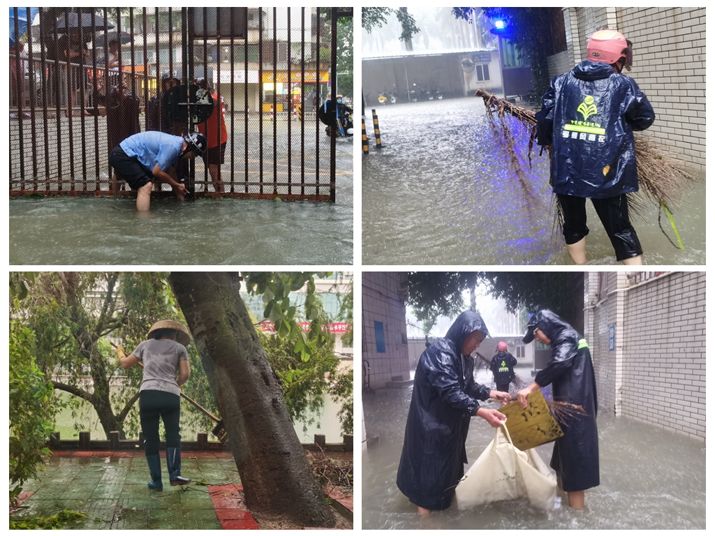 此外,学校各相关部门还搬运沙袋防止积水倒灌,检查办公楼及学生宿舍,维修门窗,加强值班值守、巡查工作,排查校内雨水、污水管道、井盖情况,发现积水和倒塌的树枝树干及时清除,做好防御物资储备和饭堂供应,确保校园安全稳定。