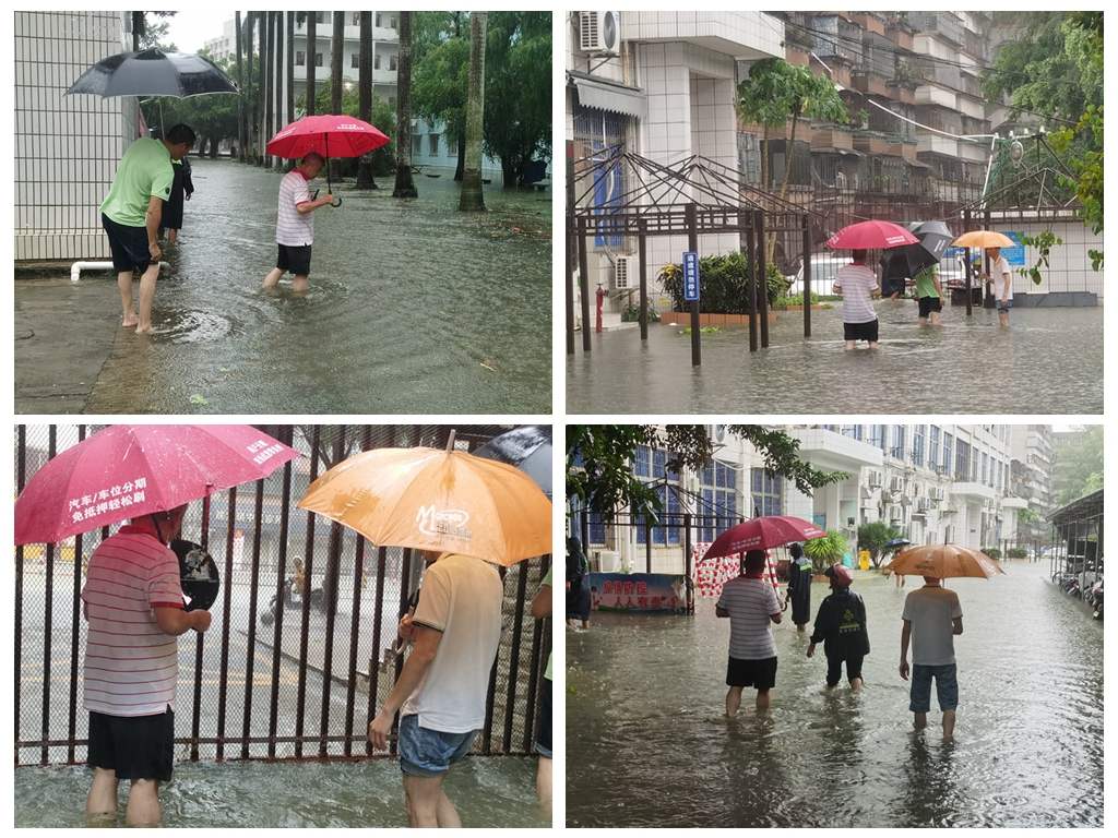 汛情发生后,党委副书记罗辉第一时间带领后勤保障处相关工作人员,先后到学校教学楼、运动场、饭堂、游泳池、学生宿舍、一号电房、实验动物中心查看汛情,现场指挥抗涝工作。尽管风急雨大,一行人仍挽起衣袖裤腿,奔走在校园积水最深处排查险情隐患。