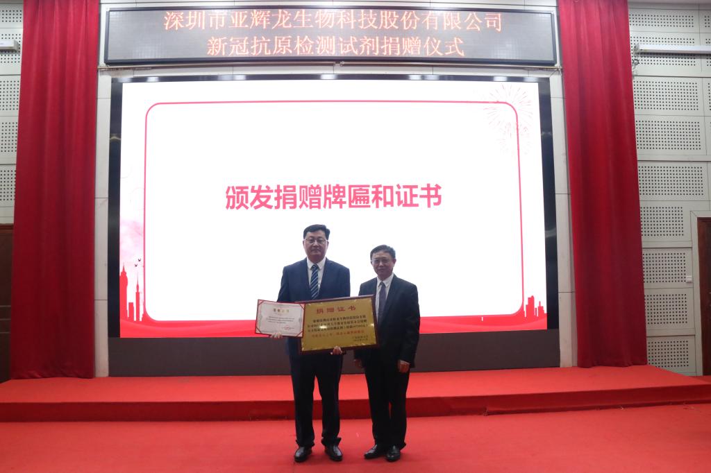 在捐赠仪式上,刘新光副校长代表新葡萄8883官网AMG教育发展基金会接收深圳亚辉龙捐赠5万人份新冠抗原检测试剂盒,并为其颁发捐赠证书及捐赠牌匾。
