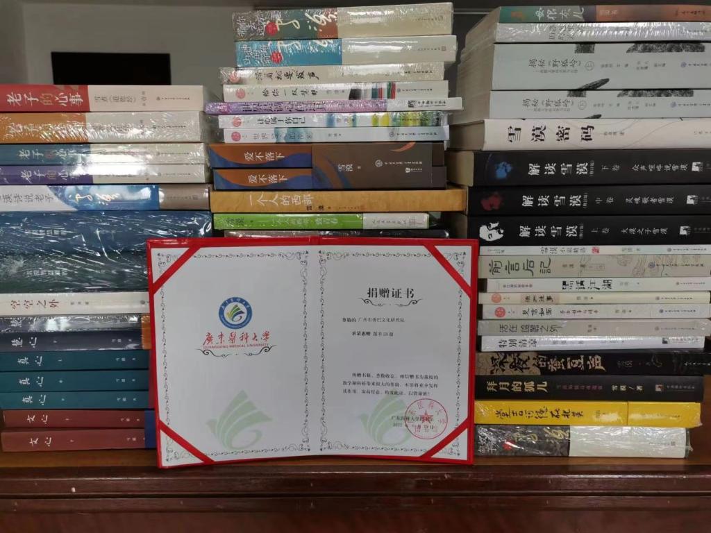 广州市香巴文化研究院了解到我们的捐书活动后,积极联系到学校图书馆工作人员,并自贴运费将近60册图书捐到图书馆。该批捐赠图书主要包括该院院长、国家一级作家雪漠的文学著作及对其著作的研究文献,如《大漠祭》《猎原》《白虎关》《西夏咒》《西夏的苍狼》《无死的金刚心》《一个人的西部》《老子的心事》《带你去远方》《解读雪漠》等。