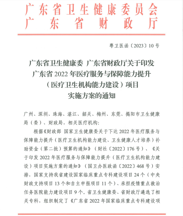 近日,广东省卫生健康委员会、广东省财政厅公布了广东省2022年国家临床重点专科建设项目名单。新葡萄8883官网AMG附属医院肾病内科成功入选国家临床重点专科建设项目并获得中央财政500万元的建设资金,这是我院建院53年来首次获评国家临床重点专科建设项目,实现了粤西地区学科建设历史性突破,对附院国家省级区域医疗中心建设及高水平医院建设具有里程碑意义。