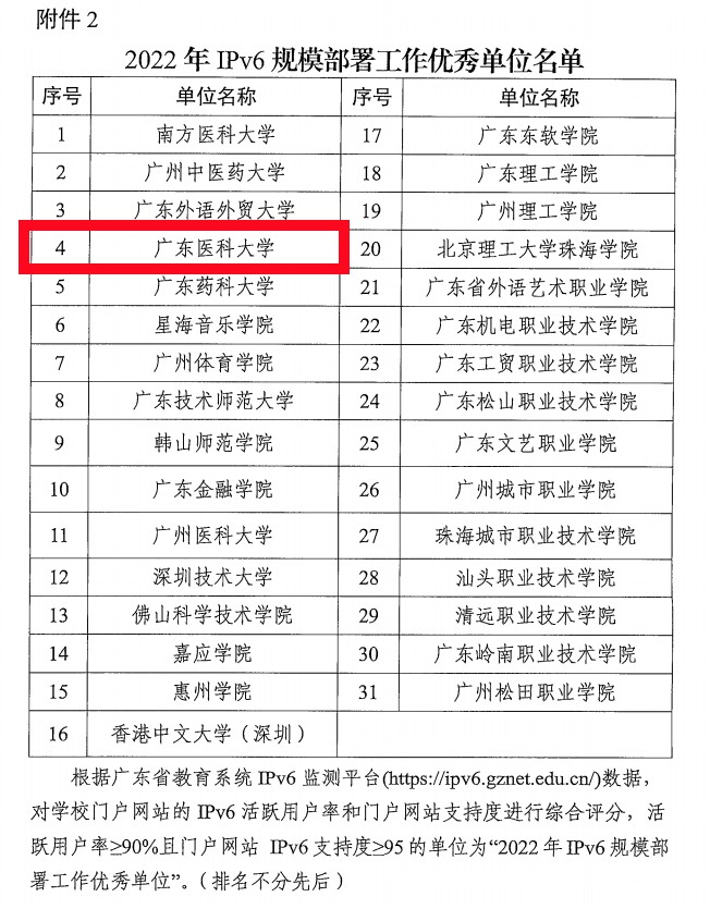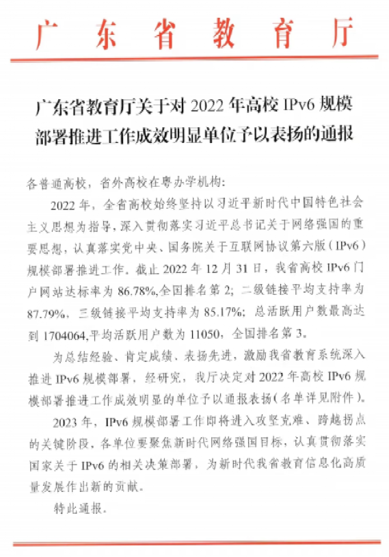 日前,广东省教育厅发布了《广东省教育厅关于2022年高校IPv6规模部署推进工作成效明显单位予以表扬的通报》,文件依据广东省教育系统IPv6监测平台2022年监测全省各高校的门户网站支持度、IPv6活跃用户率、IPv6总流量、应用网站等各项指标数据的综合评分情况,对全省2022年高校IPv6规模部署推进工作成效明显的单位予以通报表扬,其中包括标杆单位10个、优秀单位31个和积极推进单位12个,新葡萄获评“2022年IPv6规模部署推进工作优秀单位”称号,成为全省31个获此表彰高校之一。