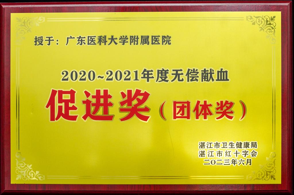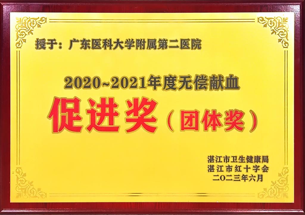2023年6月9日湛江市政府在中心人民医院召开全市无偿献血工作会议。新葡萄8883官网AMG、新葡萄8883官网AMG附属医院、新葡萄8883官网AMG附属第二医院都获得了2020-2021年度 “湛江市无偿献血促进奖”荣誉称号。
