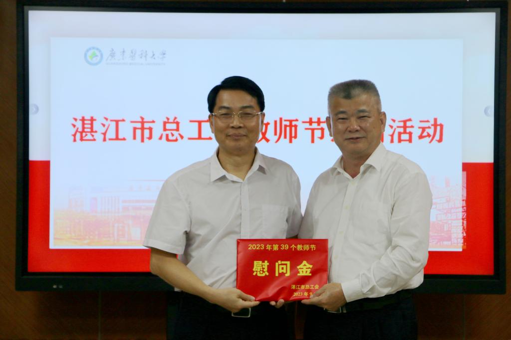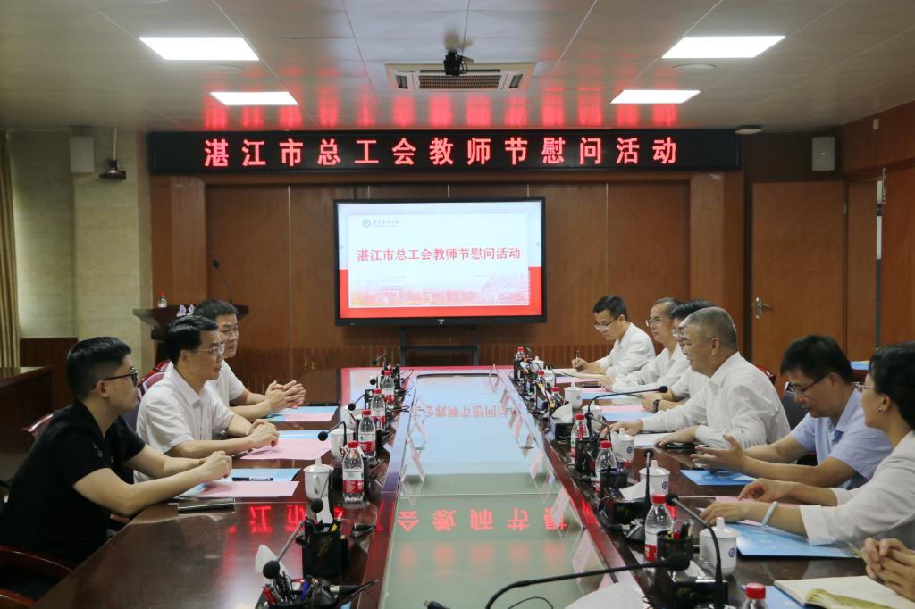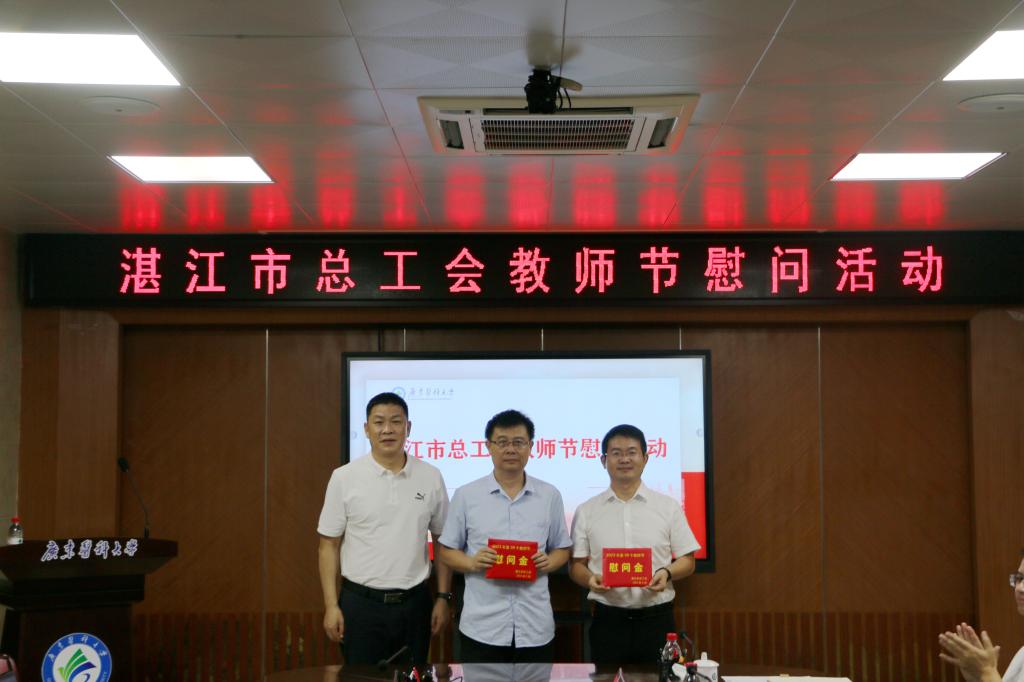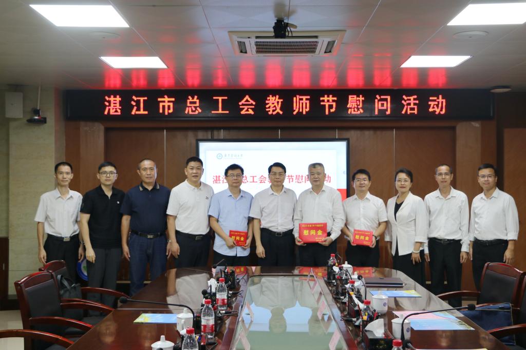 9月8日上午,湛江市人大常委会副主任、市总工会主席李更盛及市总工会党组成员、副主席邵平静等人带队到湛江校区开展教师节慰问活动,带来了工会组织的关怀关爱,向辛勤耕耘的教育工作者致以节日问候和祝福。