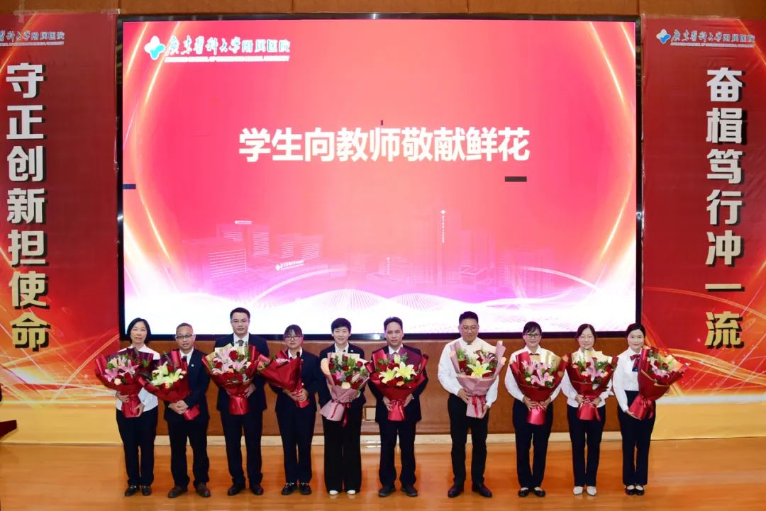会上,学生代表向教师代表敬献鲜花,新进教师代表向荣休教师代表敬献鲜花。教师,是人类灵魂的工程师。在医院教育事业蓬勃发展的大潮中,涌现出无数优秀的教师代表,他们在讲台上奋斗一生,只为将“传道授业解惑”这一平凡而伟大的事业传承好、发扬好。