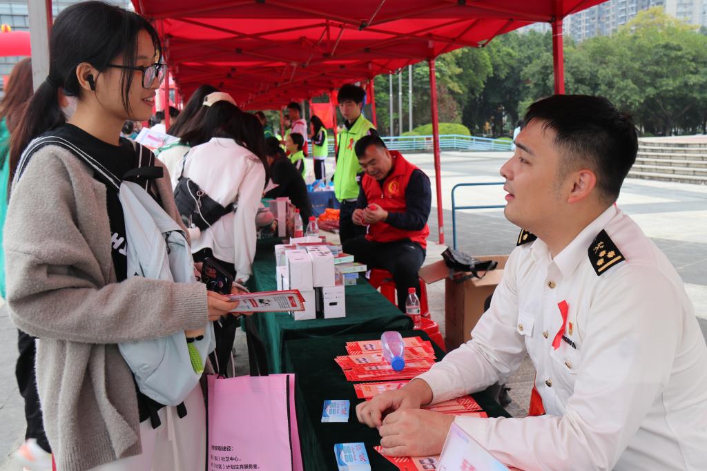 现场开展了艾防咨询、义诊、宣传展板展示、健康咨询检测、有奖互动、志愿者倡议等活动,吸引了来自东莞市各参会单位的100多名代表以及本校的师生参加。