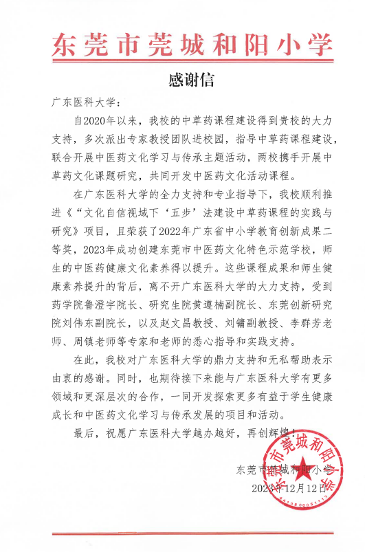 12月12日,东莞市莞城和阳小学向新葡萄发来感谢信,信中充分认可了新葡萄自2020年以来,对该校在中草药课程建设的支持,助力该校《文化自信视域下“五步”法建设中草药课程的实践与研究》获得2022年广东省中小学教育创新成果二等奖,并对新葡萄联合开展的中医药文化工作给予高度肯定,对长期以来给予该项目大力支持的药学院鲁澄宇院长、研究生院黄遵楠副院长、东莞创新研究院刘伟东副院长,以及药学院赵文昌教授、刘镛副教授、李群芳老师、周镇老师等专家和老师的悉心指导和实践支持表示诚挚感谢。