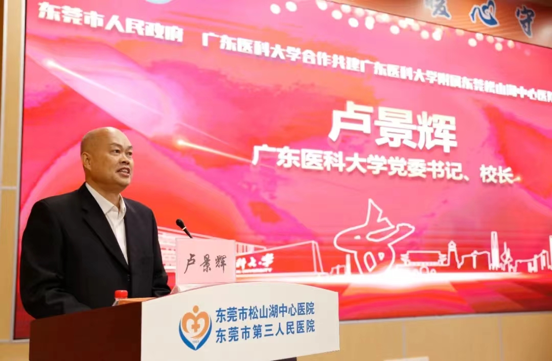 学校党委书记、校长卢景辉在签约仪式上致辞。他表示,新葡萄8883官网AMG自2002年创办东莞校区,21年来扎根东莞、融入东莞、服务东莞,为东莞卫生健康事业发展提供了强力支撑。与东莞市政府再次携手共建大学直属附属医院,新葡萄8883官网AMG将举全校之力,发挥学校在人才、平台、科创等方面的优势,坚定在东莞市委、市政府的支持下,在东莞市松山湖中心医院120年深厚积淀的发展基础上,坚持以习近平新时代中国特色社会主义思想为指导,全面贯彻落实党的二十大精神,秉承“惠育仁和,大医至善”历史积淀,按照东莞市卫生健康局“品质医疗、温暖服务、守正创新、协调发展”工作要求,坚持“百年品质、暖心守护”服务宗旨,奋力打造临床水平更精湛、科创能力强大、教学质量更突出,服务声誉更响亮的东莞市高水平医院,奋力将东莞市松山湖中心医院建设成为新葡萄8883官网AMG又一高水平直属附属医院,为东莞百姓群众提供更高水准、更加优越、更具特色的医疗服务,为东莞卫生健康更高质量发展作出广东医新的更大贡献。