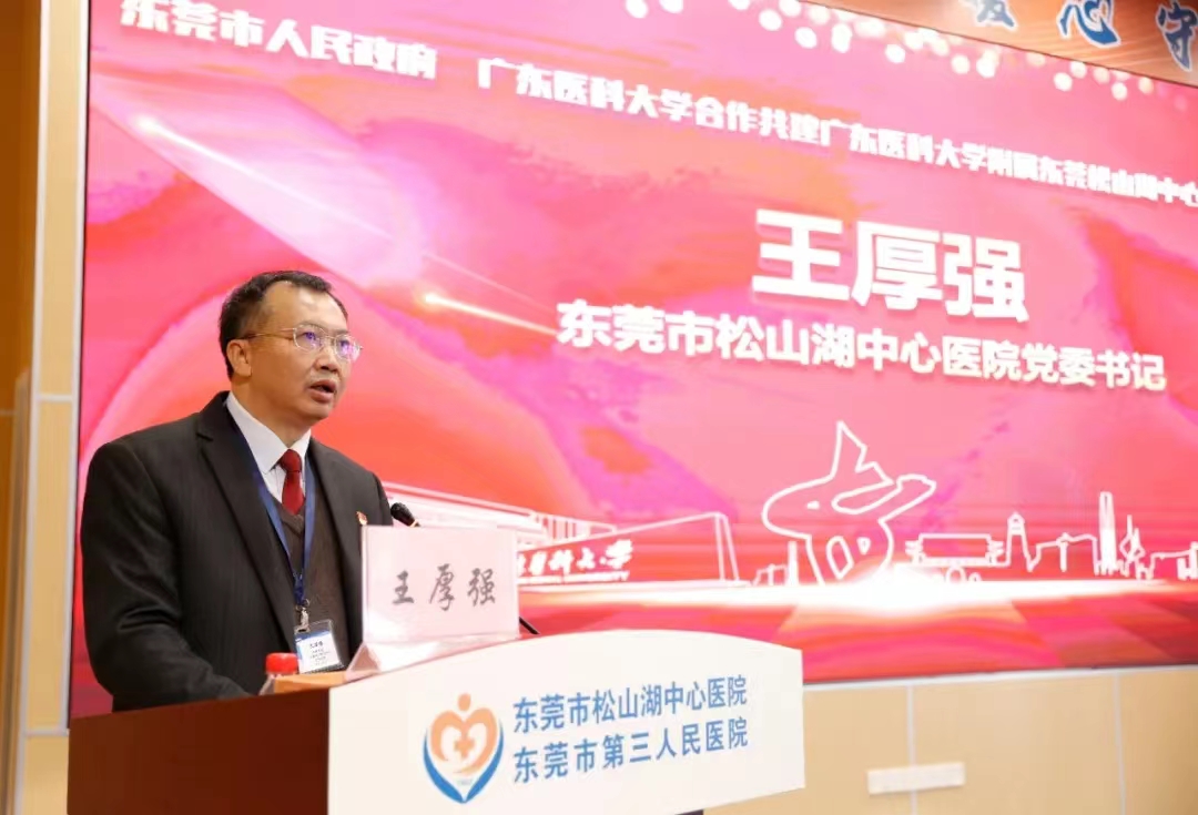 东莞市松山湖中心医院王厚强书记致辞,新葡萄8883官网AMG附属东莞松山湖中心医院正式签约揭牌,是医院破解科教研发展瓶颈、让百年惠育再续辉煌、打造高水平医院又一非常重要的里程碑。这次能成为新葡萄8883官网AMG附属医院,机会实属难得,我们一定会倍加珍惜和加倍努力,严格按校地共建的协议要求履好职追成效,绝不辜负各位领导对我们的期望。相信在市委、市政府、市卫生健康局和在座各位领导的坚强领导下,在全院员工通力合作和努力下,通过与新葡萄8883官网AMG的深入合作,在学科建设、人才培养、破除科研能力短板、提升医院整体服务能力等方面将会有长足的进步,最终实现高水平医院创建,为健康东莞、品质医疗作出更大贡献。