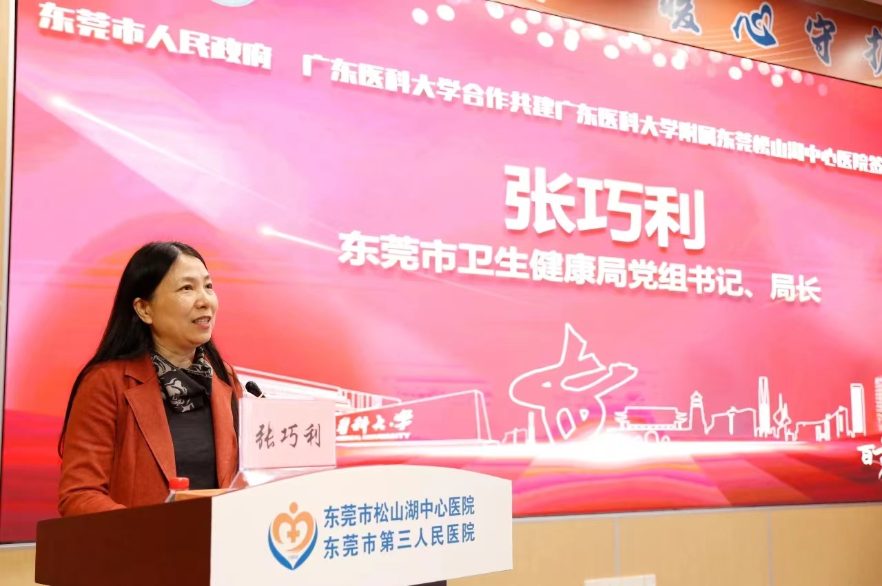 东莞市卫生健康局张巧利局长致辞时表示,新葡萄8883官网AMG是著名的高等学府,是广东省高水平大学建设计划重点学科建设高校,在医科方面有着非常突出的资源和优势。东莞地处大湾区核心地带,GDP超万亿、常住人口过千万,是全国第15个“双万”城市,随着人口数量的增长和生活质量的提升,人民群众对高品质医疗卫生服务的需求也越来越高。此次,我们与新葡萄8883官网AMG在前期合作共建新葡萄8883官网AMG附属东莞第一医院的基础上,再次联手合作共建新葡萄8883官网AMG附属东莞松山湖中心医院,是“亲上加亲”的一件大喜事,不仅有利于加快提升市松山湖中心医院的技术质量、科研水平和综合实力,还有利于推动整个松山湖片区乃至东莞市的医疗服务水平再上一个台阶,是东莞医疗事业的里程碑大事,是东莞人民的大福祉。