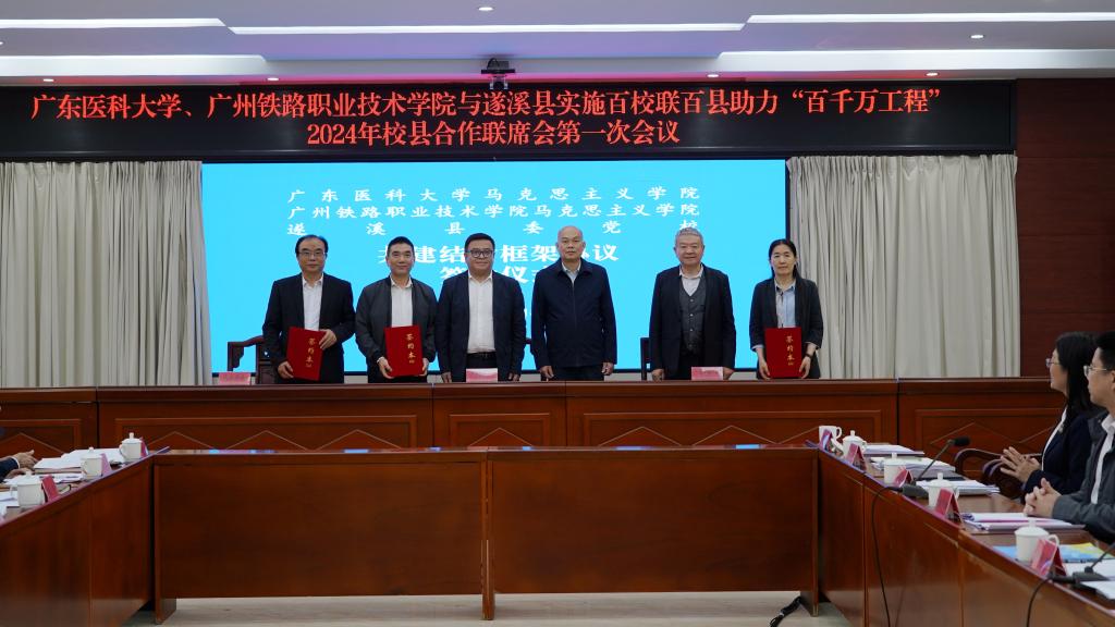 2024年3月18日,新葡萄8883官网AMG、广州铁路职业技术学院与遂溪县联合召开了实施百校联百县助力“百千万工程”2024年校县合作联席会第一次会议,新葡萄8883官网AMG马克思主义学院、广州铁路职业技术学院马克思主义学院、遂溪县委党校在会议上签订了共建结对框架协议,奠定三方在马克思主义理论研究和宣传教育领域的合作基础。未来,马克思主义学院将充分发挥在学术研究、教育资源和实践经验方面的优势,共同推进马克思主义理论的学习、研究和传播。将在人才培养、学术交流、社会服务等方面展开深入合作,为社会的和谐稳定和人民的幸福生活贡献力量,推进马克思主义事业作出新的更大贡献。