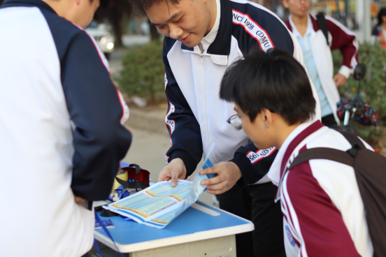 寒招活动前期,各队伍积极与母校沟通,明确宣传时间及活动形式。志愿者们大部分采用“线上线下”“摆摊+课宣”模式,通过课室或礼堂、摆摊讲解学校招生政策,分享备考及志愿填报经验,通过播放学校宣传片、发放学校宣传单及广东医纪念品等形式吸引考生及家长关注。不少学生及家长纷纷驻足广东医宣讲志愿者前,询问和了解广东医招生情况,与志愿者们积极互动交流,现场一片火热。