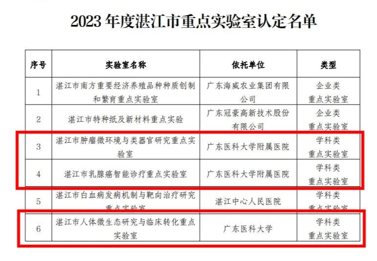 近日,根据湛江市科学技术局发布《关于认定2023年度湛江市重点实验室的通知》,新葡萄海洋医药研究院人体微生态与病原微生物课题组申报的“湛江市人体微生态与临床转化重点实验室”获批2023年度湛江市重点实验室。同时,新葡萄8883官网AMG附属医院血管甲状腺乳腺外科“湛江市乳腺癌智能诊疗重点实验室”及肺部肿瘤专科“湛江市肿瘤微环境与类器官研究重点实验室”也成功列入市级重点实验室认定名单。
