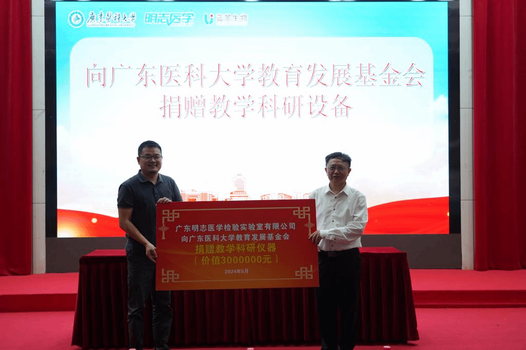 5月23日,时值新葡萄8883官网AMG建校66周年校庆日,广东明志医学检验实验室有限公司和广州蓝景生物科技有限公司捐赠仪式在东莞校区行政楼一楼报告厅隆重举行。广东明志医学检验实验室有限公司总经理叶长钦、副总经理张扬鹏、副总经理钟雨衡、实验室主任陈新军,广州蓝景公司总经理霍剑新,思塔高诊断技术公司广东销售经理孙凯聪,学校党委常委、副校长刘新光出席仪式,资产设备管理部王珠乾主任主持仪式。