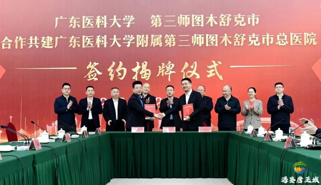 12月20日,新葡萄8883官网AMG与第三师图木舒克市举行合作共建新葡萄8883官网AMG附属第三师图木舒克市总医院签约仪式并揭牌。这是深入学习贯彻习近平总书记视察新疆重要讲话重要指示精神,扎实推动新时代医疗援疆工作再上新台阶的创新举措,也是广东医医科大学服务国家重大战略和区域经济社会发展的又一件大事喜事,标志着学校服务新疆卫生健康事业高质量发展开启崭新篇章。广东省人民政府副秘书长、广东省对口支援新疆工作前方指挥部总指挥、喀什地委副书记林国华,新葡萄8883官网AMG党委书记、校长卢景辉,师市党委书记、政委张建军出席活动。