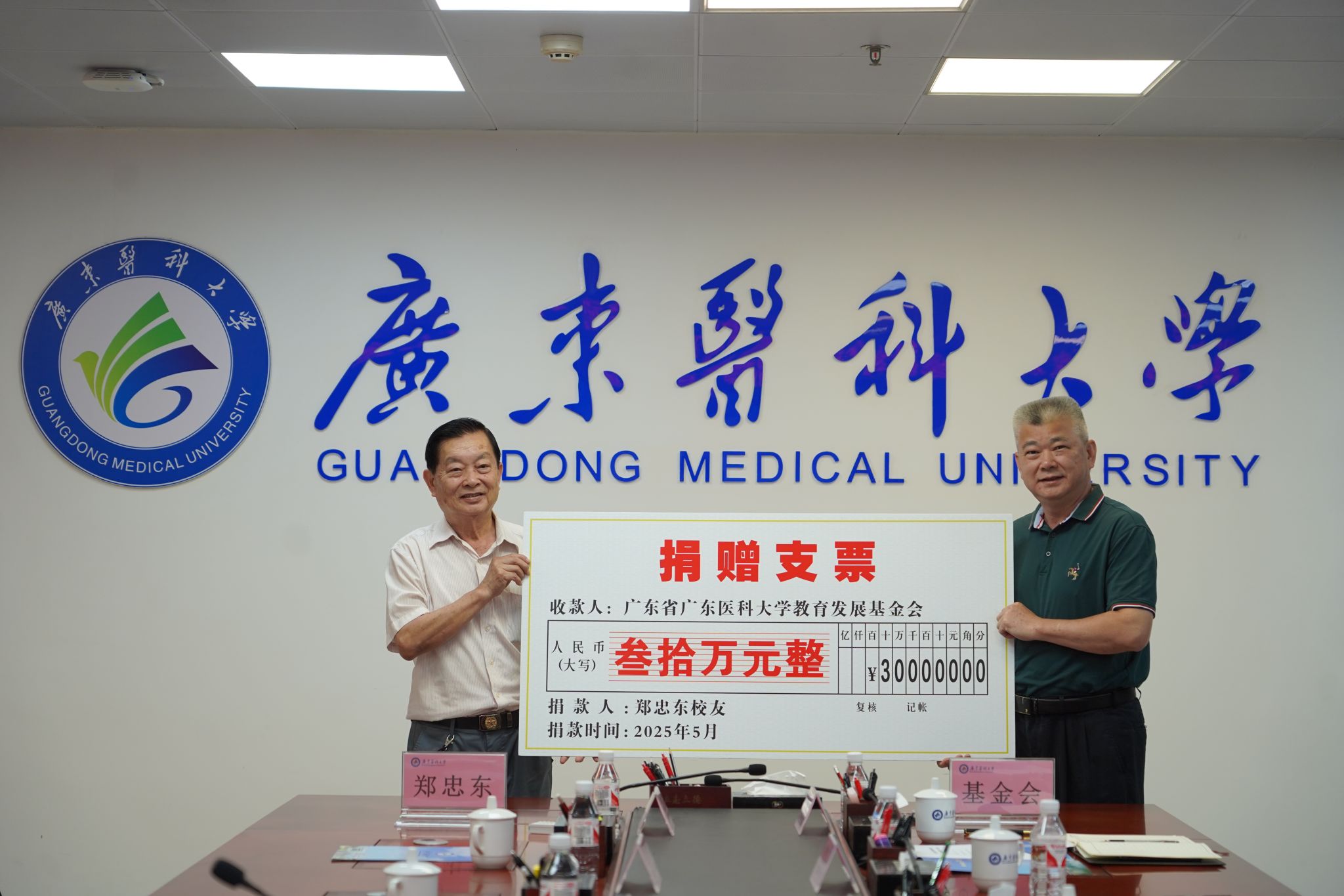 2025年5月23日校庆日当天下午,新葡萄8883官网AMG湛江校区第一会议室举行了一场简朴而庄重的捐赠仪式。学校党委副书记黄达海、1965级临床医学校友郑忠东、教育发展基金会理事长罗辉,以及科学技术部、教务部(招生办公室)、校友会办公室、基金会秘书处等部门负责人和学生代表共同见证了这一暖心时刻。仪式由学校办公室主任、基金会秘书长杨丹主持。