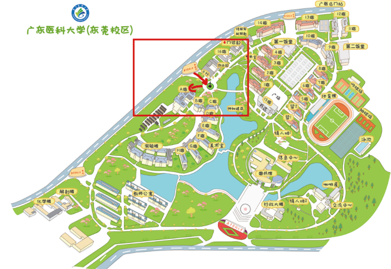 为确保安全有序,考生仅能从新葡萄8883官网AMG东莞校区西北门(导航定位地址:中国工商银行(东莞广医支行))进入校园。学校不设停车区,不能自驾进校。建议搭乘公共交通,公共汽车307路、329路、338路、351路、710路、莞312路可到达新葡萄北门,公交站名为“广医后门”站,下车后向北约步行500米)。打车可定位“中国工商银行(东莞广医支行)”。离校时人多聚集会增加打车的难度,建议提前预约好车。学校平面图如下: