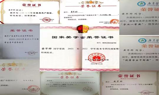 三年来,黄芊桦的学习成绩一直名列前茅,综合三年加权平均分位列专业第一名,综测成绩专业第一,一次性顺利通过CET-4、CET-6考试,还成功考取了雅思(IELTS)语言证明,全国计算机二级(WPS)证书,并连续两年获得国家奖学金、学业一等奖学金等。