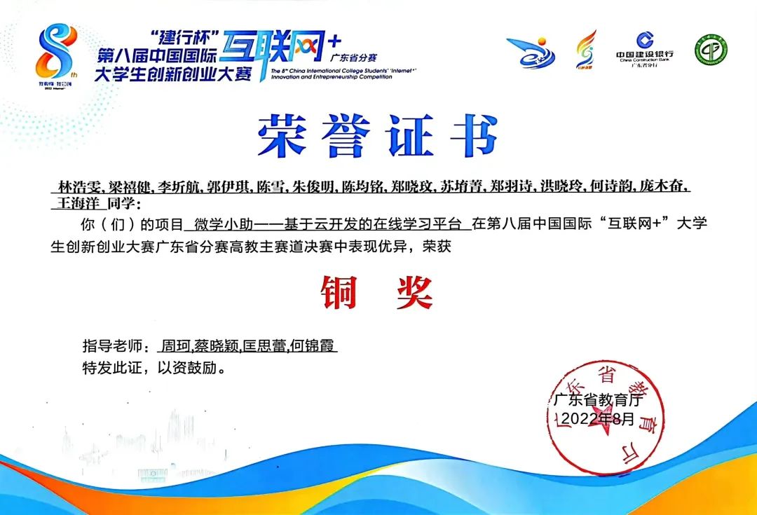 陈均铭专注于创新创业,作为第一临床医学院院团委科研工作站策划部部长,在老师的指导下,积极策划“挑战杯”等赛事,在第九届医学模型设计大赛决赛中担任主持人,主持3项大学生科技创新课题,获得“挑战杯”广东大学生课外学术科技作品竞赛省赛三等奖、第八届中国国际“互联网”大学生创新创业大赛广东省分赛铜奖、广东青年大学生“百千万工程”突击队涉海项目暨湛江市青年创新创业涉海项目竞赛比赛二等奖。作为“微学小助——基于云开发的在线学习平台”的项目答辩人,陈均铭在“互联网+”大学生创新创业大赛中获得广东省铜奖和校赛三等奖,该项目还获多项软件著作权,孵化出一家微学科技网络公司。