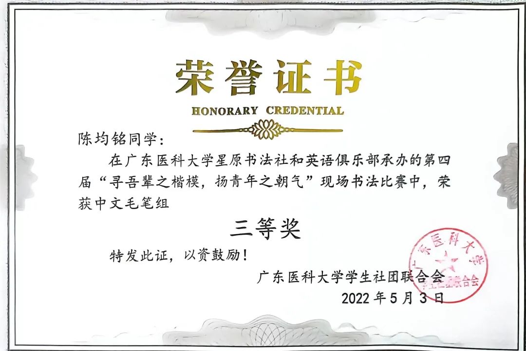 大一以来,陈均铭共获国家级荣誉8项、省级荣誉4项、校级荣誉20余项。每一项成绩的背后,都闪耀着一名广东医学子不负韶华、踔厉奋发的底色。