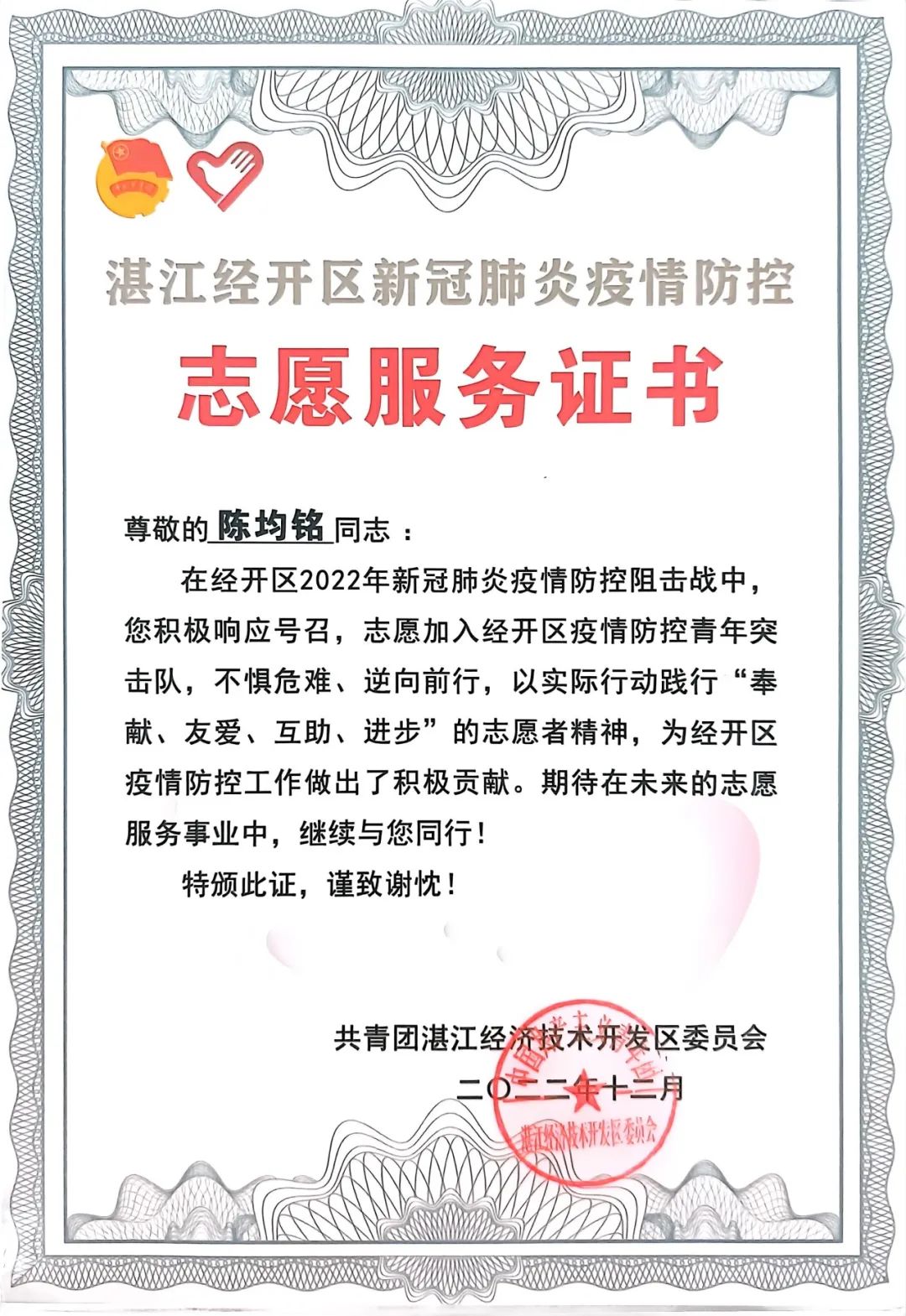 将青春书写在祖国的大地上,一直是陈均铭的追求。他说:“实践出真知”。于是,他积极组织和参加社会实践活动,所在“微尘·心”公益团队孵化出的优秀项目《守护含羞草——关爱乡村少年儿童性教育志愿服务项目》获得第六届中国青年志愿服务项目大赛全国赛银牌,参与的“点亮吾乡——打造徐闻新名片”“色彩海门——海门创意文旅图鉴”社会实践活动暨“百千万工程”突击队活动获得省立项。在新冠肺炎疫情防控中,陈均铭以专业知识做好防护,并积极参与疫情防控工作,获得湛江经开区新冠肺炎疫情防控志愿服务证书。