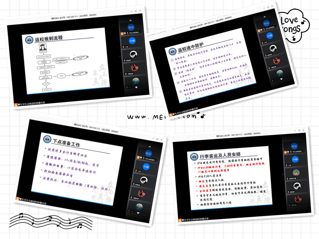 随后,辅导员黄天佑老师、凌志甫老师详细地讲解了返校、下点的工作安排,叮嘱同学们返校前填好《新葡萄8883官网AMG学生健康卡》、准备好口罩等个人防护用品、严格遵守疫情期间学校的各项规定……强调返校报到流程、行李装运及人员安排,提醒大家离校前清退宿舍、清缴水电费、打扫好宿舍卫生等,并讲解下点后事宜。最后,黄天佑老师针对同学们提出的疑问进行了互动交流,并勉励同学们“无梦想,不青春”“愿你的能力配得上你的野心和所受的苦难”。