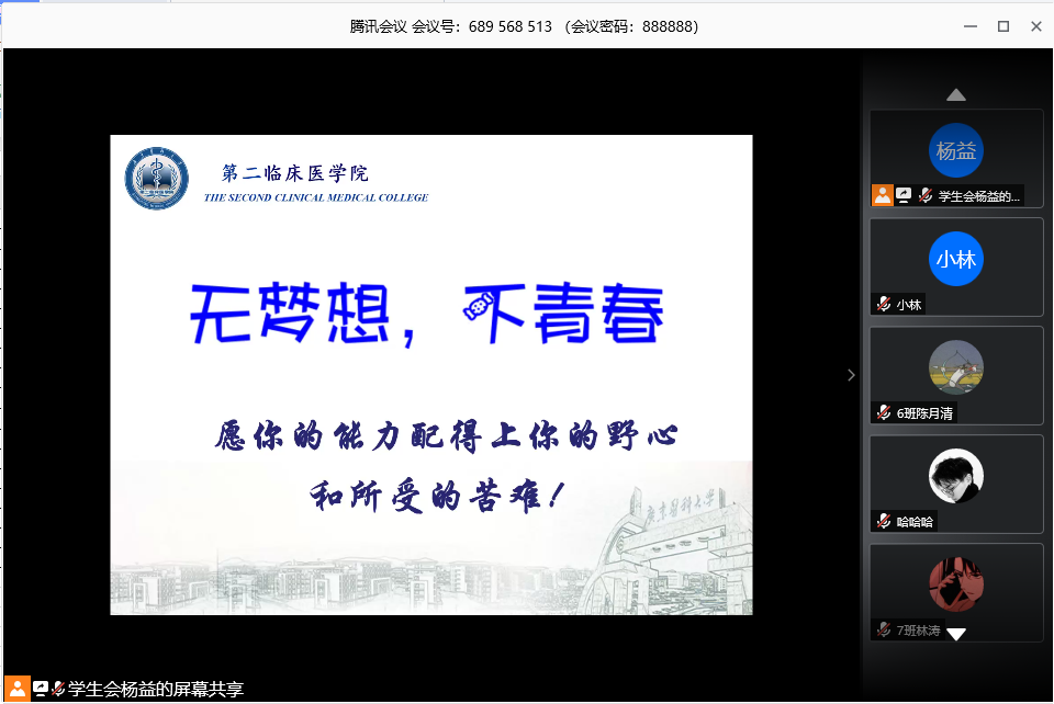 5月12日晚,第二临床医学院2017级临床医学专业学生返校下点工作布置会议在“腾讯会议”平台举行。会议分两个场次举行,第二临床医学院官成浓院长、陈珊书记、丁喜生副书记、黄天佑老师、凌志甫老师以及全体2017级临床医学专业学生参加了会议。