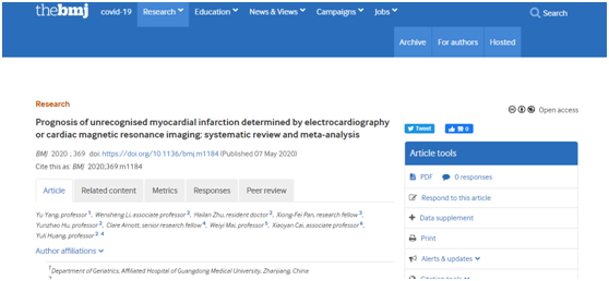 日前,附院老年医学中心杨宇博士等在国际顶级医学期刊《英国医学杂志》(The British Medical Journal, The BMJ)发表系统综述《Prognosis of unrecognized myocardial infarction determined by electrocardiogram or cardiac magnetic resonance imaging: systematic review and meta-analysis》。The BMJ创刊已有180年历史,是目前国际公认的四大顶级医学杂志之一,其最新影响因子为27.604。这是继该院感染内科研究团队今年3月在《柳叶刀-传染病》(IF 27.516)发表通讯文章后又一新高影响因子论文。