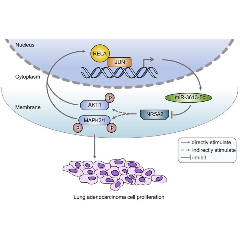 核因子κB(NF-κB)是一种广泛表达的转录因子,它参与了多种正常生物学进程的调控。已有报道显示,NF-κB的异常激活在大多数肺癌的发生和发展中至关重要。然而,将NF-κB作为肺癌的直接治疗靶标仍然是一个挑战。本研究发现,microRNA-3613-5p通过促进细胞增殖,以及作为NF-κB/RELA和AKT/MAPK信号通路之间联系的正反馈环的关键调控因子,在肺腺癌病变过程中发挥重要作用。该研究结果为肺腺癌的早期诊断与治疗提供了新的分子靶标线索。
