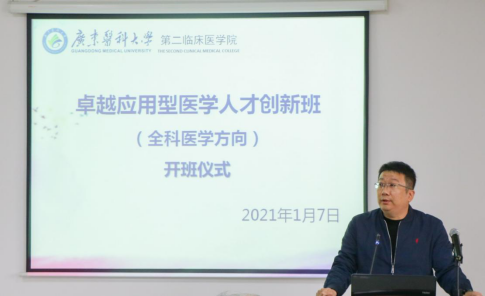 开班仪式上迟宏罡副院长向参会人员介绍了创新班的情况。创新班推行“1234”人才培养模式,即1个核心(全科思维),2个导师(校内专业导师/社区医生导师),3种学习(课堂学习/业余科研/社区实践),4种能力(学习能力/人文素养/临床实践/科创能力)。