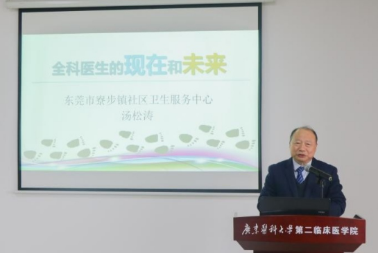 开班仪式结束后,东莞市寮步镇社区服务中心汤松涛主任应学院邀请,为创新班做首场学术讲座。汤松涛主任从习近平总书记在十九大的报告切入,谈中国全科医学的发展历程,分享全科医学的特点和发展前景,提出“全科医生”是健康的守门人,是社保费用守门人的理念,号召广大医学生为居民健康保驾护航。