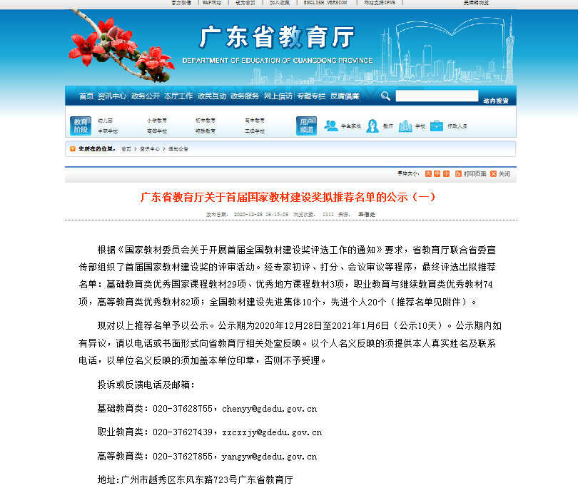 根据广东省教育厅2020年12月28日网站公示通知,新葡萄周克元教授主编、刘新光教授副主编的教材《生物化学》获得省厅推荐参加首届全国优秀教材评选,相关申报材料已通过申报系统报送,并寄送到省教育厅统一报送至教育部参评。