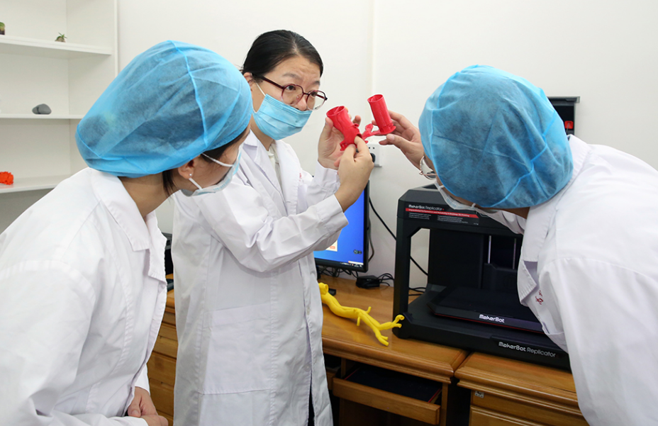 邓丽利用3D打印的主动脉夹层模型指导团队成员开展研究工作