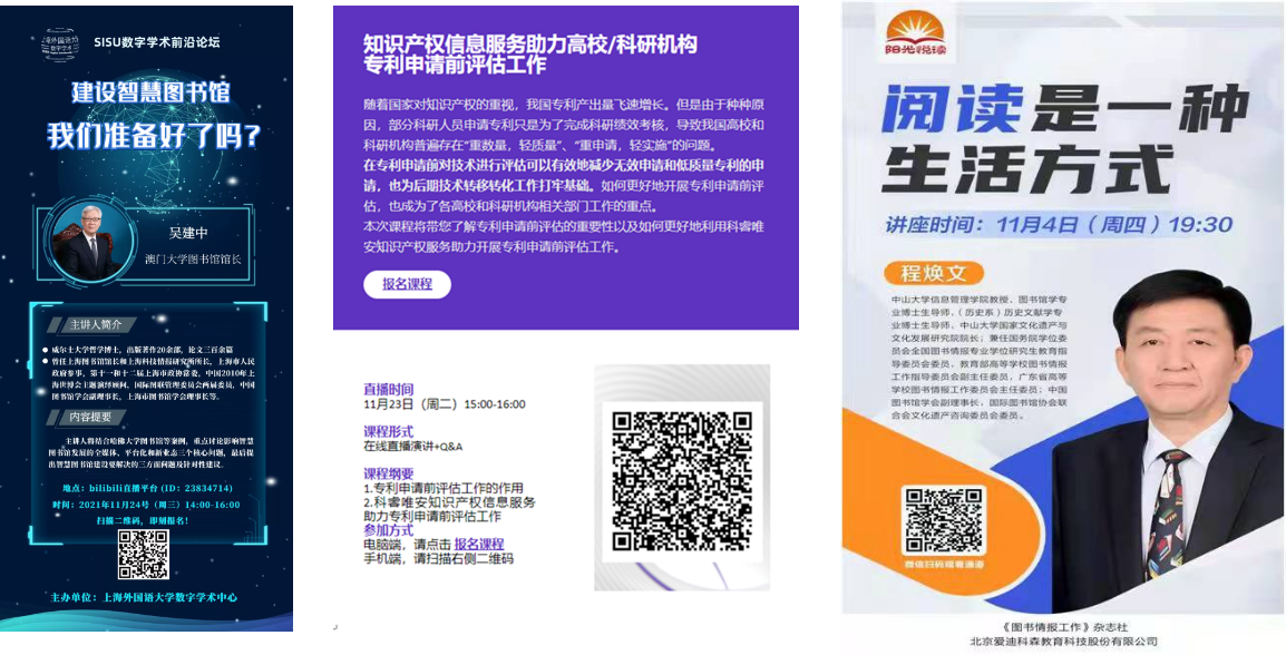 线上培训的主题包括:澳门大学图书馆馆长吴建中全方位、多角度探讨新时代智慧图书馆建设的相关问题;南方医科大学图书馆组织的“知识产权服务案例分享”,多层次、多视角分享近年来广东省内各高校图书馆在专利信息服务方面的进展与成效;中山大学程焕文教授以丰富的实例讲解的什么是阅读推广,怎样做好阅读推广,将阅读推广的理念传递给每位馆员,使馆员真正理解阅读的涵义、务实加强阅读推广。