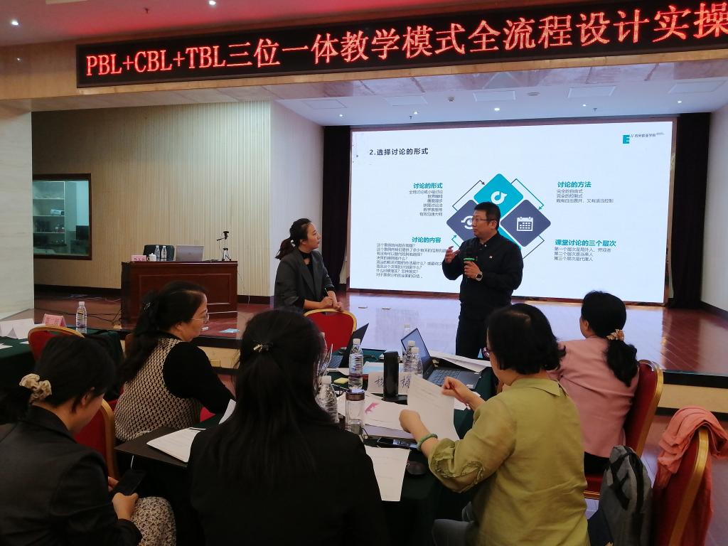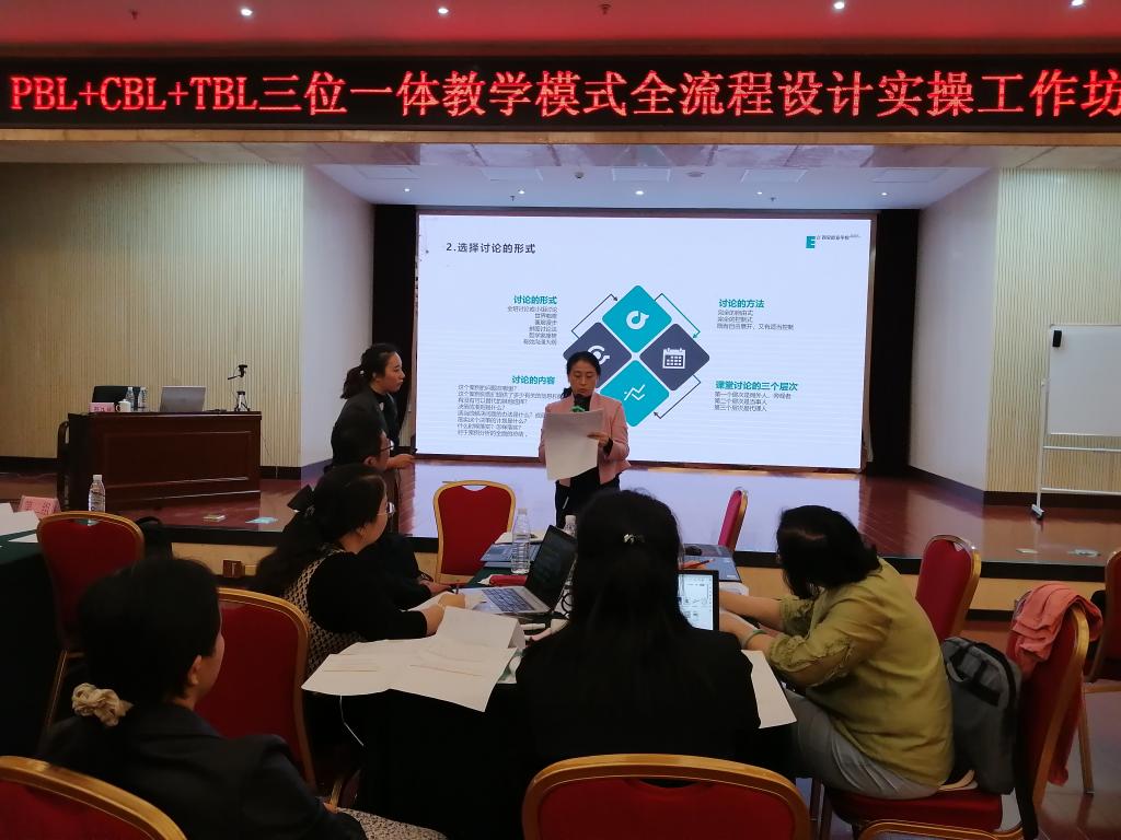 工作坊通过讲练结合、课堂实操演练、案例解析、小组互动交流、阶段性成果展示与专家点评指导等多种方式,从PBL、TBL、CBL 三种教学模式的目标分解、基本要求与实践应用等方面内容展开深入阐释,帮助参训教师从不同角度深入学习和掌握 PBL+CBL+TBL 三种教学模式交融的具体方法和步骤,从而提升学生学习成果,提高课堂教学育人水平。