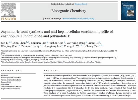 近日,药学院陶成博士团队针对松香烷内酯型天然产物jolkinolide E和euphopilolide成功发展了一条针高效的不对称合成路线。该研究以“Asymmetric total synthesis and anti-hepatocellular carcinoma profile of enantiopure euphopilolide and jolkinolide E”为题,在线发表于在知名化学期刊Bioorganic Chemistry(doi:10.1016/j.bioorg.2023.106688)上。药学院硕士研究生李鑫为论文的第一作者,陶成博士为通讯作者(新葡萄8883官网AMG为第一署名单位)。